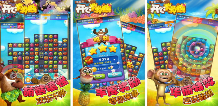 该游戏是一款与熊出没官方合作推出的益智消消乐类游戏,所以玩家在游戏中需要消除的内容大多都是熊出没中的元素,并且在大面积的方块被玩家消除之后该游戏还会发出熊大的搞笑语音,并且值得一提的是该游戏的背景音乐所采用的是熊出没动漫中的原声哦!