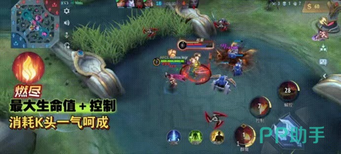 第2个技能燃尽,它可以使用火焰,对敌人造成控制效果,而且每一次控制都会对敌人的生命有一定的削减消耗的时间会持续4~5秒钟,在使用过程中也可以对周围的小兵野怪等等共同释放伤害,消耗他们的生命值。
