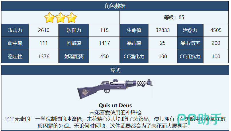 总之,未花是一位非常强力的输出角色,她拥有高额的暴击伤害、贯通效果、范围伤害和命中值提升等优点。她适合在室内和屋外场地发挥作用,可以作为主力或者火力支援参与战斗。如果你喜欢未花的外貌和性格,也可以在游戏中和她互动,送她礼物,提高她的好感度,解锁她的剧情和语音。