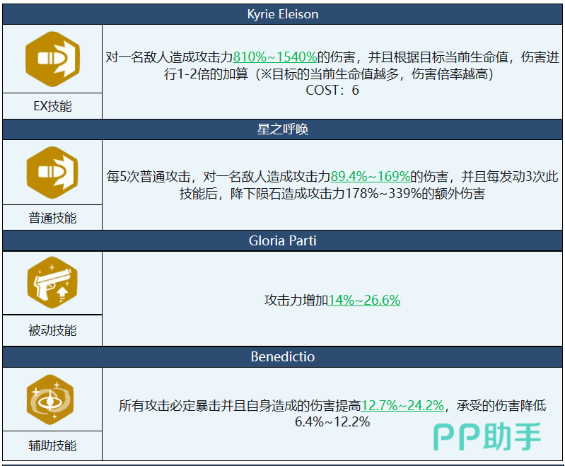 未花的技能有四个,分别是EX技能、普通技能、被动技能和附加技能。EX技能叫做Kyrie Eleison (求主垂怜),每20秒,对圆形范围内的敌人造成攻击力150%~286%的伤害。普通技能叫做星之呼唤,会心值增加14%~26.6%,命中值增加160~304。被动技能叫做Gloria Patri (荣耀颂词),对贯通克制敌人造成额外伤害。附加技能叫做Benedictio (祝福),我方全体命中值增加9.1%~17.3%。