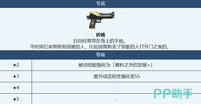 日向是一个阳光活泼的女孩,她的专武是一把名为“太阳之枪”—祈祷,它可以发射出炽热的光芒,对敌人造成大量伤害。日向的专武有以下几个特点:专武星级:日向的专武最高可以升到3星,每升一星都会增加日向的攻击力和暴击率。