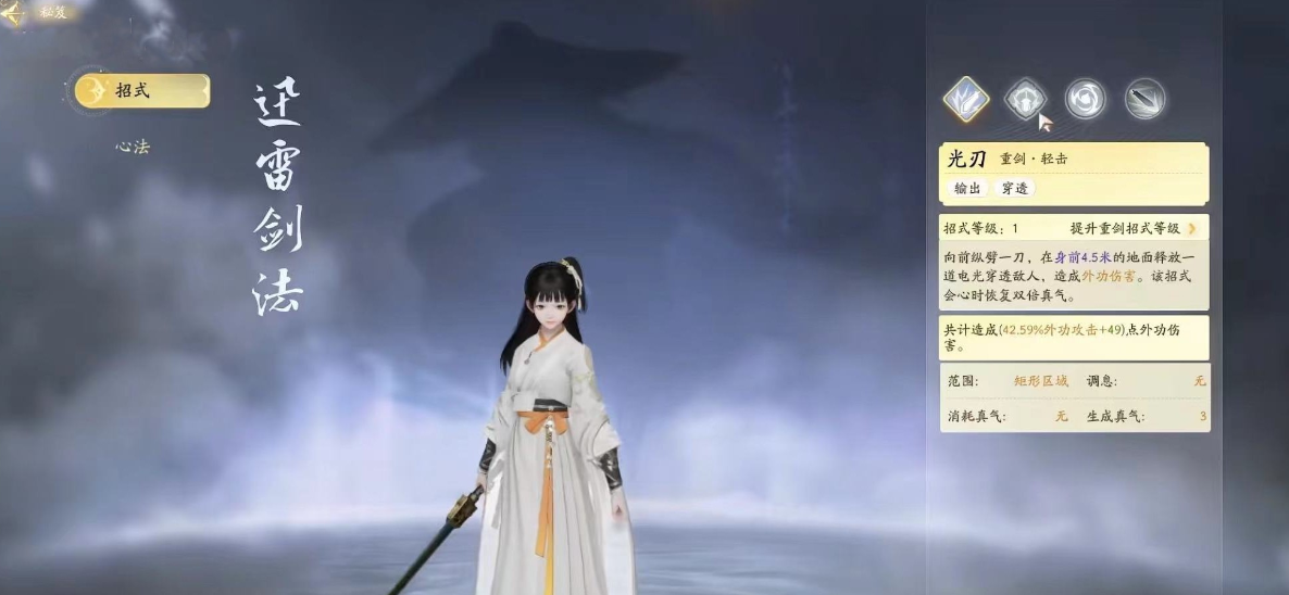 而迅雷剑法是一种高级的重剑技能,可以在郭靖线中学习,有以下几个招式:光刃:这是迅雷剑法的基础技能之一,可以在鼠标左键连点时释放,造成外功伤害,并且可以发射出远距离的剑气。跃空劈:这是迅雷剑法的另一个基础技能,可以在鼠标右键按住时释放,造成外功伤害,并且可以跳起来落下时释放迅雷剑气。