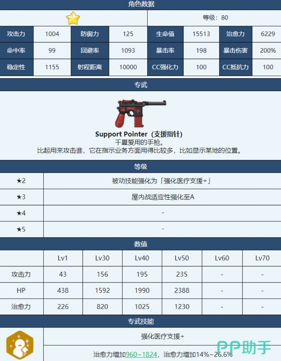 她的武器名字叫做支援指针,外观是一个十分小巧的手枪同时手柄也是红色的,千夏对于它也是十分喜爱的,它的作用是可以帮千夏增加医疗支援能力,这一点对于团队增益来说是非常关键的,同样也是比较适合屋内作战,屋外作战它的感应力则会下降。