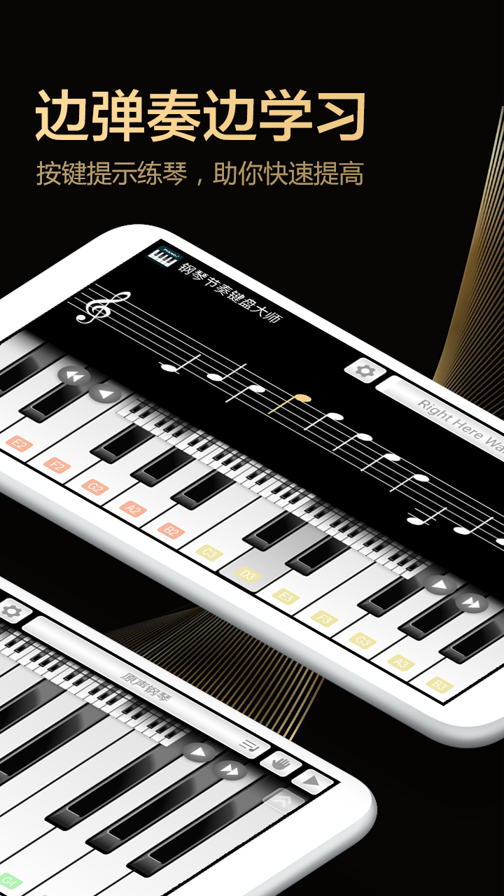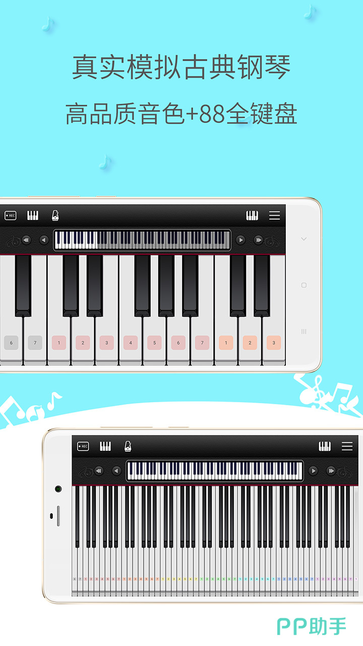 它属于完美仿真钢琴的模拟器,黑白键排列相同,音色品质高,支持双排和对弹演绎,还能实时录音和回放音乐,即时练习钢琴曲,在按键震动、键盘锁等功能下呈现极致效果。