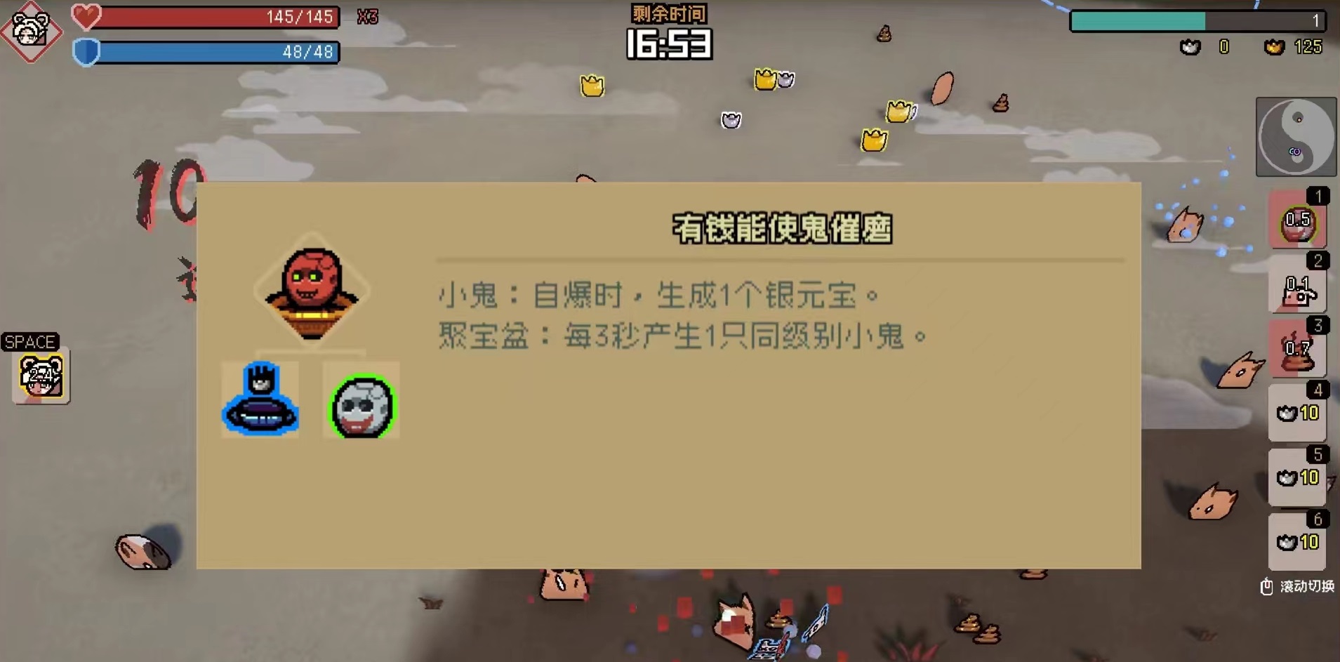 首先要了解的是该角色主动技能,会将周围召唤物吃掉,并且随机获得属性,主要包括会心、阴魂等,所以提升核心关键就是快速进行大量召唤,然后利用主动技能吃掉,这样往复循环自产自销。小编首先推荐的就是有钱能使鬼推磨玩法,采用的是小鬼和聚宝盆组合,小鬼自爆时能产生一个银元宝,而聚宝盆每三秒就能产生一只同级别小鬼,这样召唤物数量直接就多了起来。提供了大量输出和银元宝。