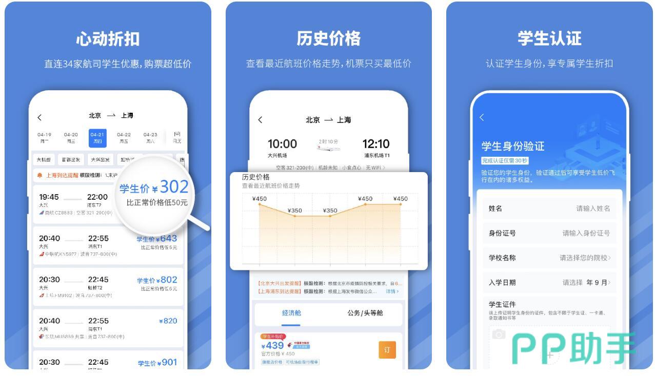 专门针对学生的一款机票软件,大家只需要通过认证之后就能够享受到实惠的机票预订价格,同时app当中也支持各位进行抢票,大家还可以针对出行的时期以及航班进行选择。当然了,软件当中也会为大家提供不同时期的历史价格让用户们进行参考,而各位的每一次预订也都将被系统保存,方便后期大家一起来管理相关的乘坐记录。