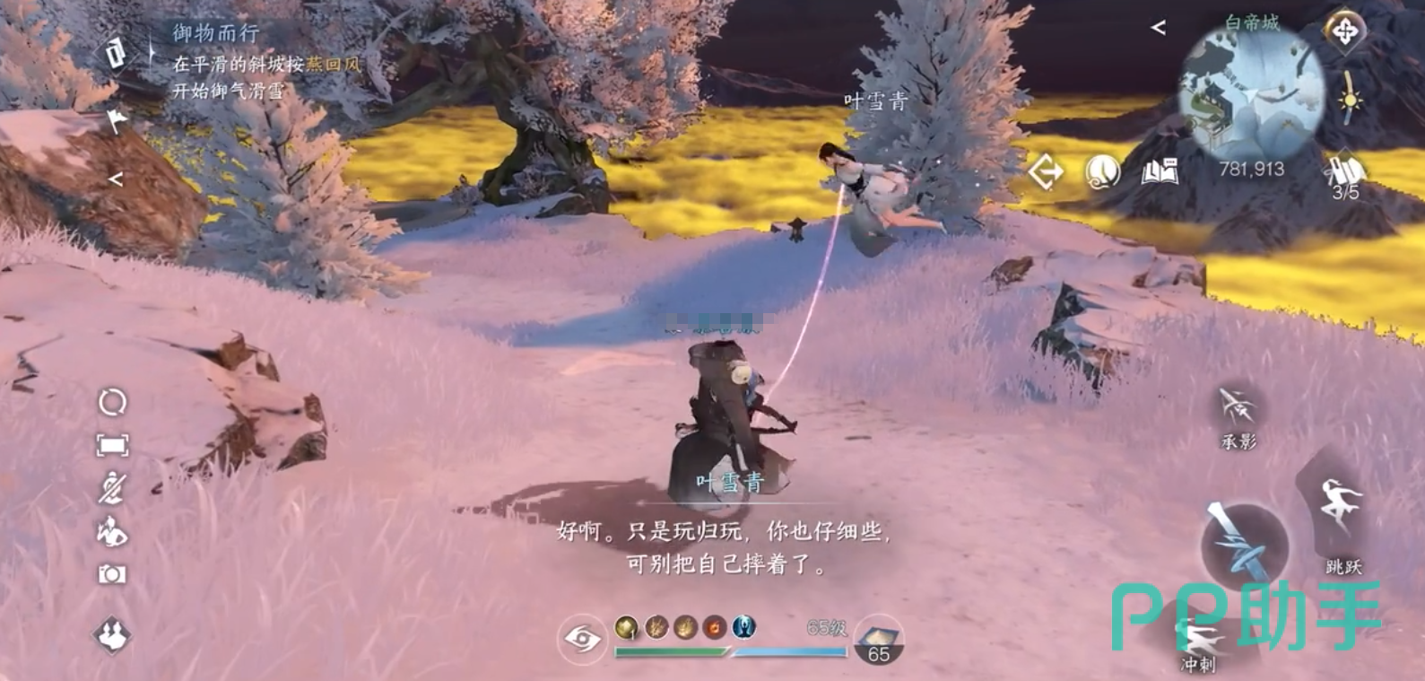 确认空中花草已收集完毕,往岸边发光的地方降落,得到师姐的夸奖。御物而行任务下一步切换场景到白帝城的滑雪场,坐标是白帝城782909。