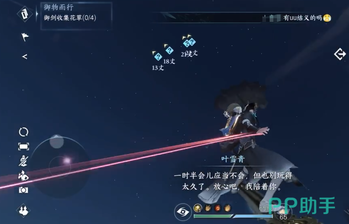 点击学习后,即可带着师姐一起御剑飞,操作的方法是滑盘控制视觉方向,方向盘控制前进方向。御物而行里还有4个收集空中花草的挑战任务,骑着剑触碰发光的花草就算收集成功。在进入御剑飞行之前,可以在游戏界面视角改为主机视觉,操作会更加容易。