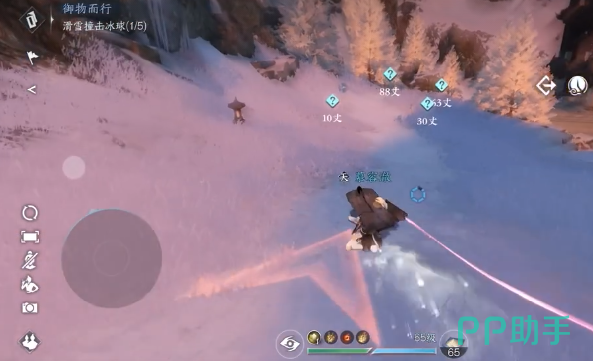触发任务挑战:在平滑的斜坡按雁回风开始御器滑雪,原路要撞击5个冰球。建议不熟练操作的玩家不要加速太快,很容易滑过冰球没有判定撞击成功。如果原路有没有碰到的冰球,玩家划完雪之后,原路回去再撞击也没问题,因此完成的难度不高。