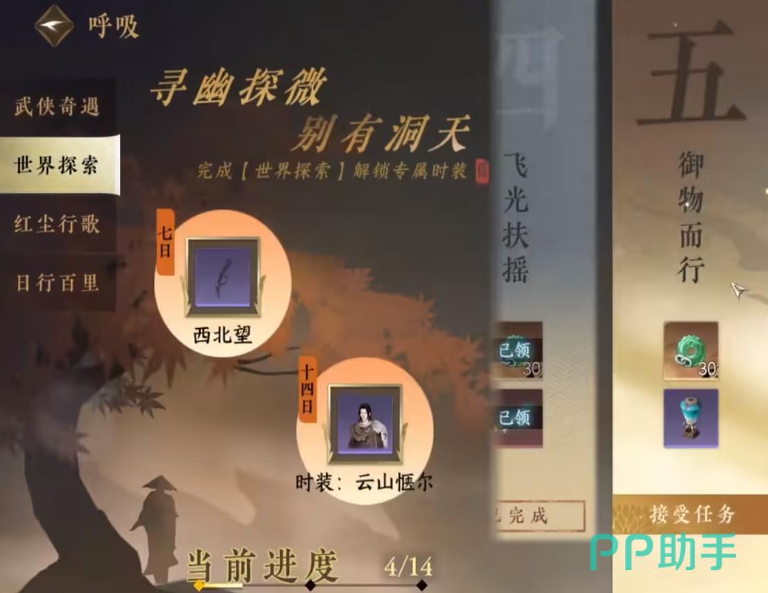 首先,点开屏幕右上方第2个拿剑侠客的图标,选择世界探索第5个御物而行,接受任务后会自动锁定在屏幕右方的任务追踪栏。点击御物而行任务,打开师姐给你发的信件,收到叶雪青的邀约。