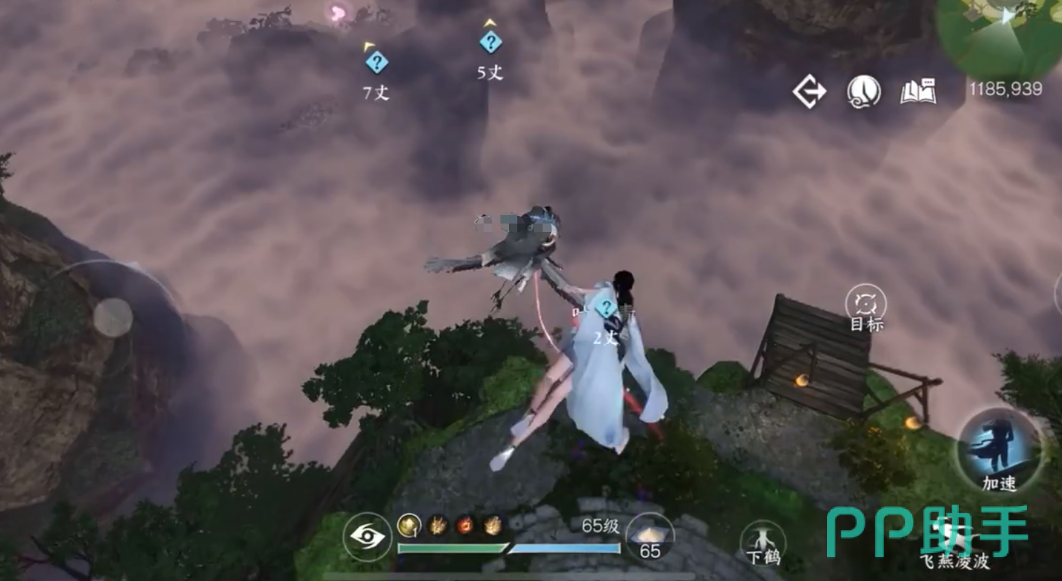 白鹤吃完野果心情不错,玩家可以骑着鹤背飞行,触发挑战任务:御鹤收集4个花草。与御剑收集空中花草挑战不同的是,御鹤的高度更高,任务物品更分散,所以挑战难度更高。但幸好没有时间的限制,玩家可以先飞到高处,滑动视角向下,按着前进键慢慢俯冲。