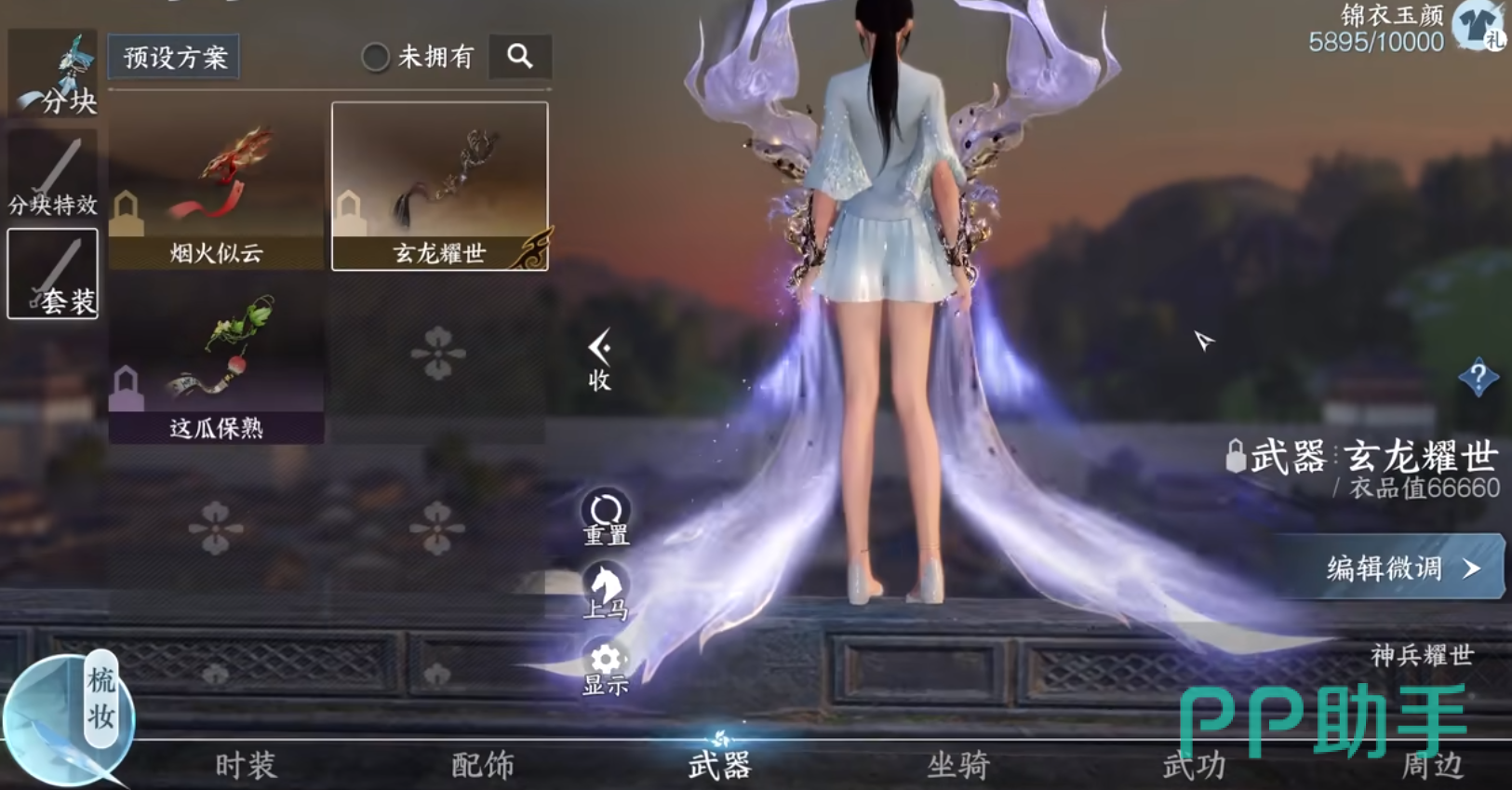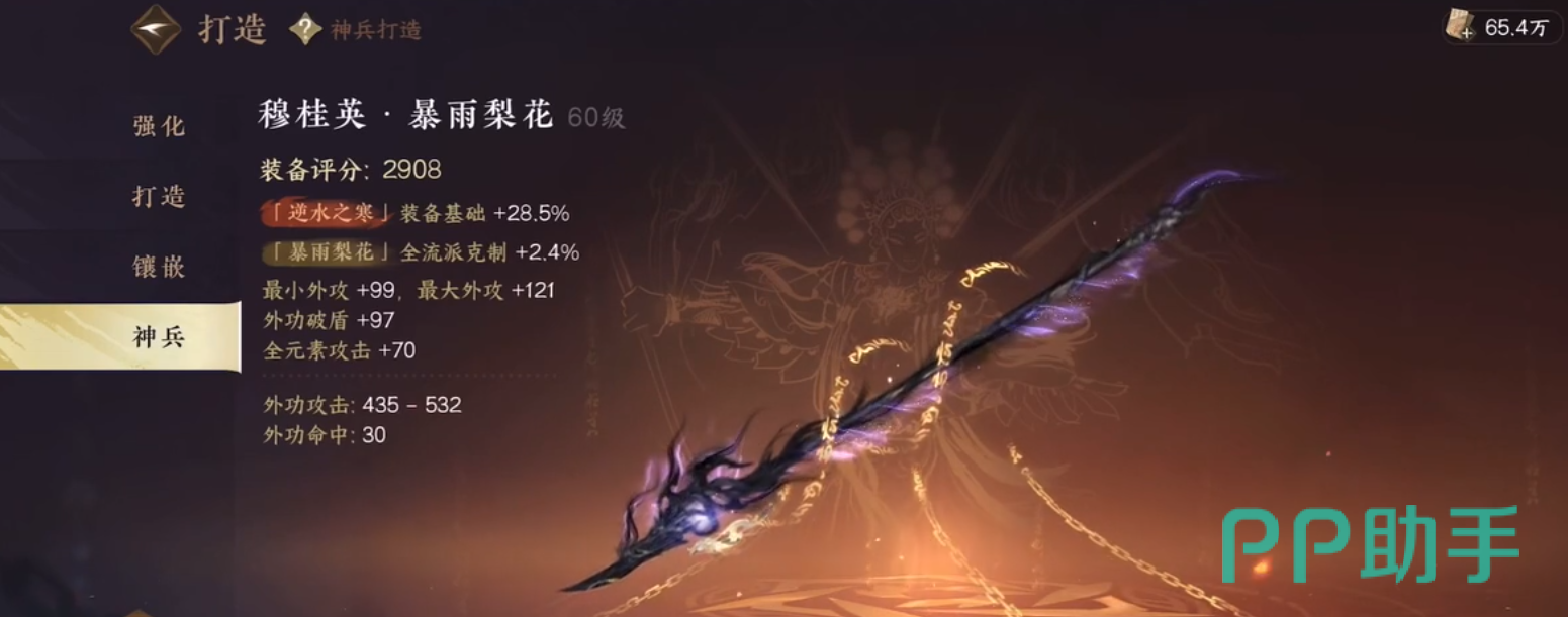 神器有穆桂英暴雨梨花、苏振衣流光弑月、玄龙耀世等,比一般副本掉落的最高武器属性多30%左右,并且附有外观特效。每个神兵都有自己的器心列传,大家打造时候可以看到武器的故事。