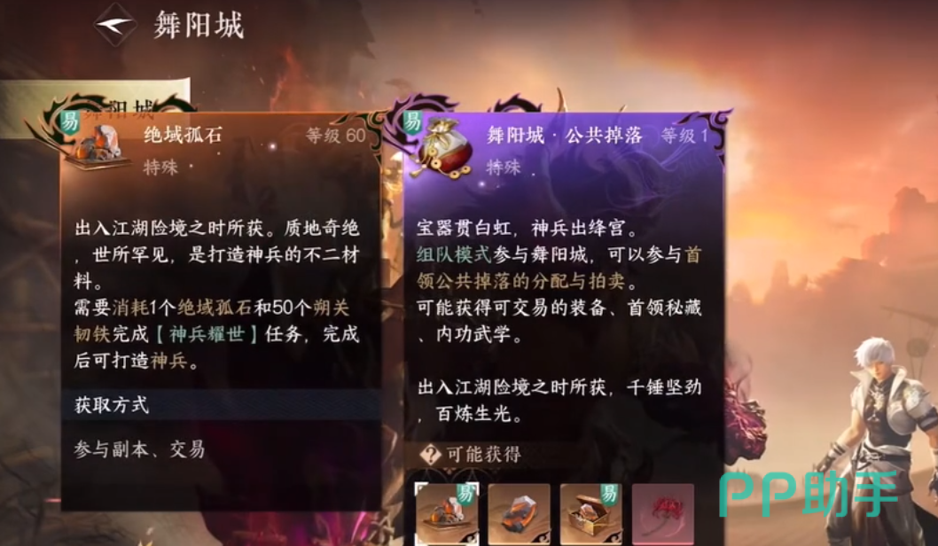 目前打造神兵方法与团本挂钩,因为只有舞阳城的团队副本会产出绝域孤石还有朔关韧铁,而且这属于公共掉落,玩家参与首领公共掉落的分配和拍卖随机获得,所以刷本也比较看脸。铸造一个神兵需要消费1个绝域孤石还有50个朔关韧铁,完成神兵要是任务提交就能打造神兵。