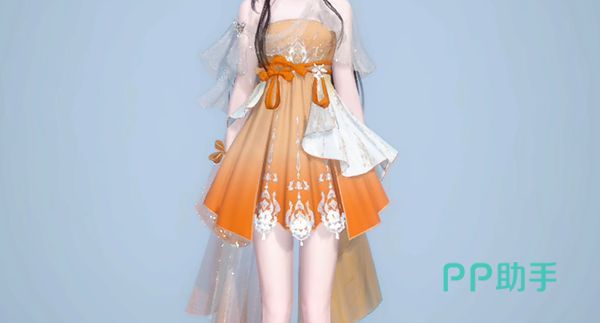这套服装非常的好看,主要颜色是白色的,腰间还挂了一个橙色渐变的类似于扇形的东西,背后的拖尾有白色和橙色两色合成,在裙子的内搭里面还有亮晶晶的钻石在灯光下闪耀,还有一条红色的收腰,显得腰线非常的纤细。
