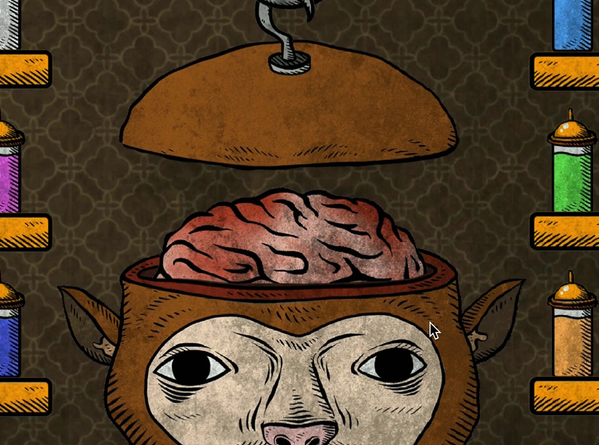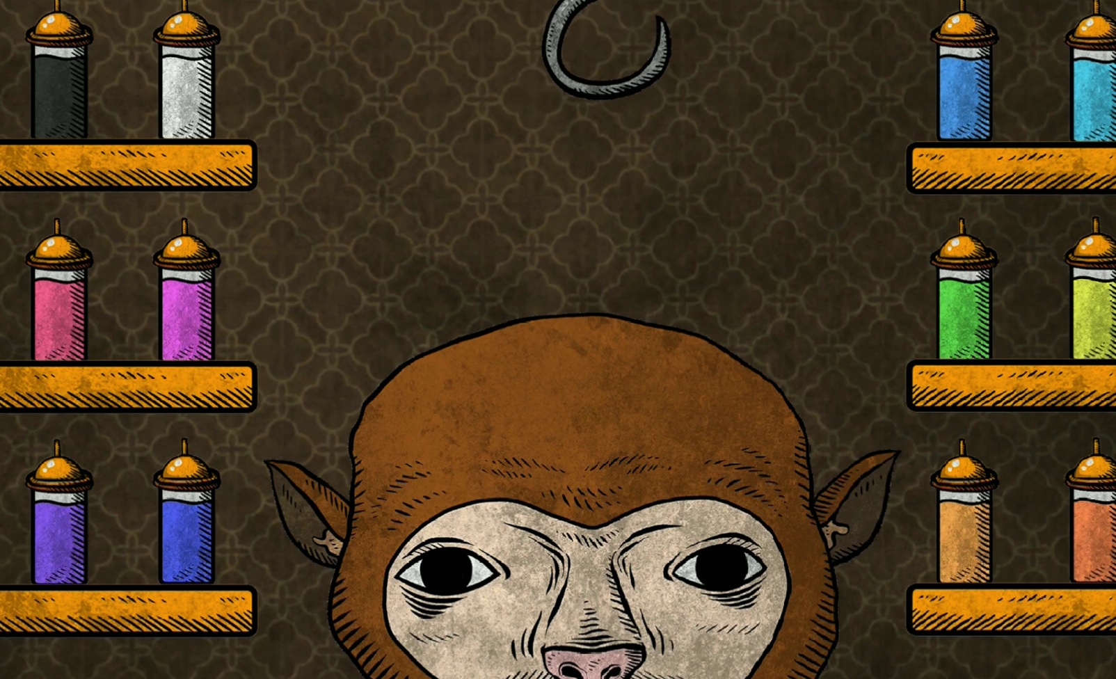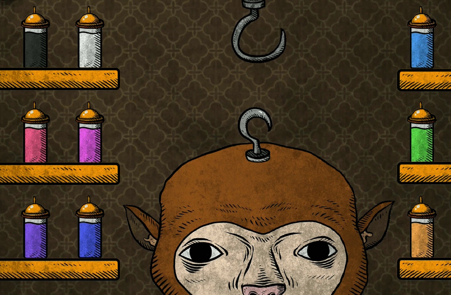 这一关的画面中心为一只猴子的脑袋。猴子脑袋的上方,最上方有一个钩子,这个钩子可以活动往下勾住东西。而左右两侧分别摆放了三排不同颜色液体,当玩家们分别点击这些不同颜色的液体时,此时猴子的脑袋上就会变换出不同的道具。这些道具分别包含了“人体器官”、“植物花草”、“皮卡丘的耳朵”等等丰富的元素。
