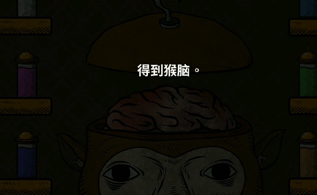 当玩家点击右侧第一排第三个绿色的液体时,此时会出现对应钩子。然后我们再点击最上方的钩子,就可以将猴脑打开,取出里面的大脑了。