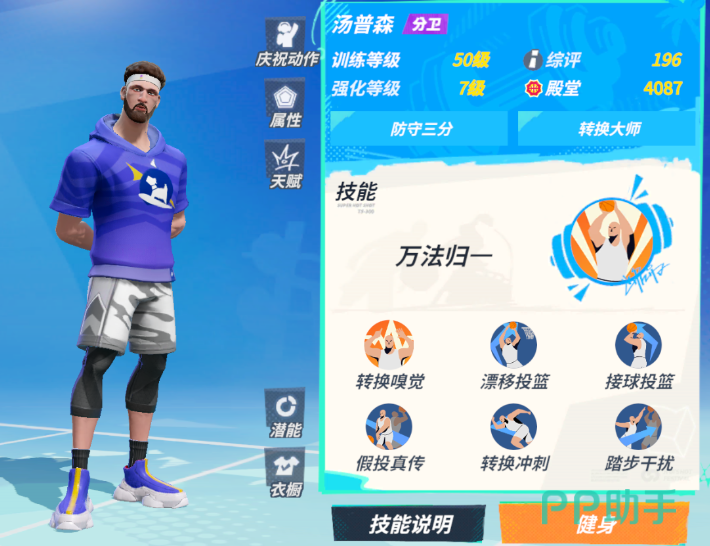 技能这块,他的爆发技万法归一在使用后可以令下次空位投篮必定命中,无论是压哨接锅还是读秒绝杀都十分好用,同时转换嗅觉还可以在双方交换球权后,通过接球立即完成突破上篮或者撤步上分,得分效率非常之高。