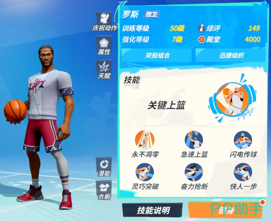 小技能这块他有四项都是为进攻服务的,其中干拔跳投可以出其不意直接起跳投篮,快速的出手速度往往能打得敌人措手不及,被战意强化后它更是会转变为更加难以封盖的后仰投篮。