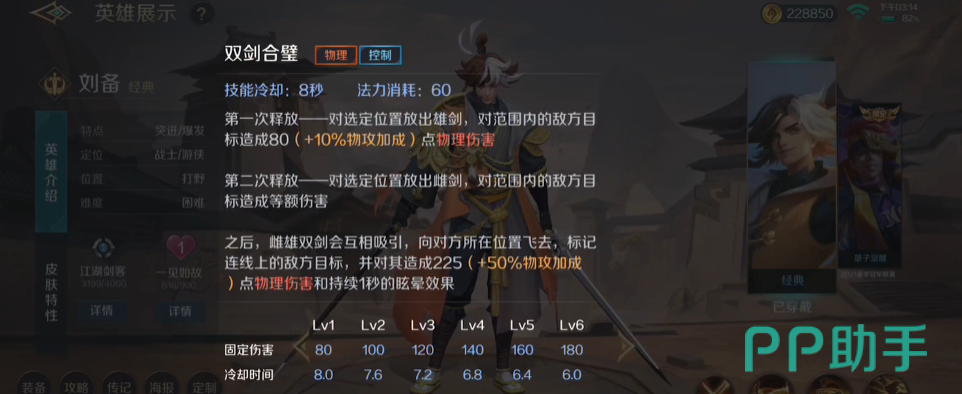 刘备的技能分为被动技能和主动技能两种。被动技能是剑斩乾坤,每两次普通攻击后,刘备会同时攻击,造成额外的物理伤害并标记目标,标记可以叠加,每层提高刘备对目标的伤害。主动技能有三个,分别是瞬息千里、风云剑诀和双剑合璧。瞬息千里是刘备的位移技能,可以让他快速冲向选定位置,并打出aoe物理输出和减速效果。双剑合璧是刘备的多段输出技能,可以让他在一定时间多段输出,并且双剑会键换位置并标记对手。风云剑诀是刘备的大招,可以让他召唤自身分身协助战斗,对技能指向区域打出物理伤害并群体标记,剑气会产出一个减速风墙,敌方目标途径风墙会减速50%。