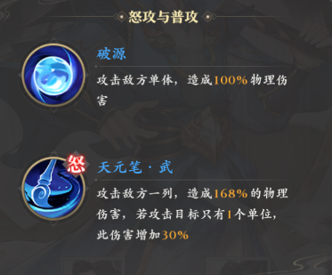 然后他的普攻是100%加成的单体物理伤害,比较平平无奇,怒气技能则是攻击一列的敌人,加成倍率有168%,并且一列的攻击目标如果只有一人,那么还会额外再增加30%伤害,所以它无论是对群还是对单都有卓越成效。