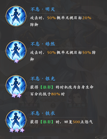 觉醒并培养至三星后还能获得“不息”的四种效果,包括了50%几率无视敌人部分防御,以及获得银影那60%减伤的时机提前,还有额外的怒气回复。