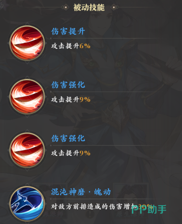 继续培养之后可以解锁一个6%的攻击提升和两个9%的攻击提升,周元高攻击的优势得以进一步凸显,同时他的另一专属被动“混沌神磨·魄动”也将激活,可以在攻击敌人前排时获得30%的增伤。