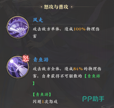 在输出层面, 左丘青鱼主要依靠物理伤害来削减对手血线,她的普攻加成是正常的100%,怒攻加成却只有84%,不过攻击的范围囊括敌人全体,而且本身还可以获得不可驱散的青鱼游状态,这一状态能够令其闪避一次敌人的怒攻。