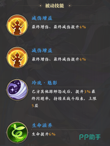 被动方面,她自带两个4%的增伤和减伤,同时在队友遭受怒攻后,还能够提升最多15%的闪避率,她的生存能力因此进一步提升。