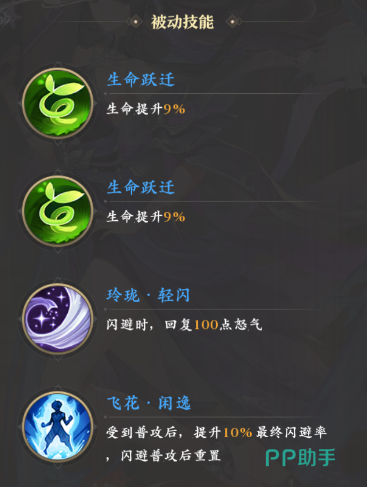 此外,左丘青鱼还有着三种生命提升的被动,配合其自身不俗的基础生命能产生很高的收益,同时玲珑·轻闪还能令其闪避时恢复一百怒气,而“飞花·闲逸”则可以令她在普攻后获得10%的闪避率。