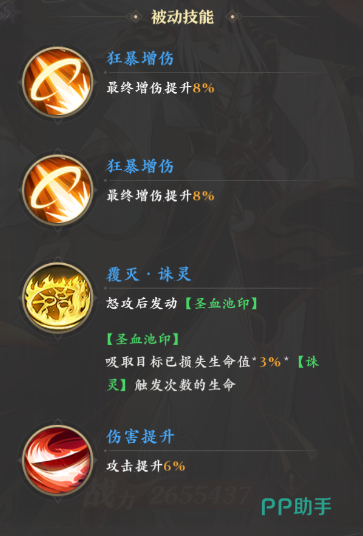 被动方面仍然包含了照例的五种属性提升,圣元这里提升的是伤害和攻击力,对于进攻端会有很大帮助,自己的独有被动则是“覆灭”和“窥伺”系列的技能,其中覆灭包括了能够吸血保障续航的“诛灵”,以及能提升吸血效果和攻击力的“重劫”。