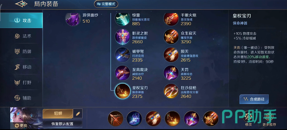 小编经常会先出时空之靴,来减少技能CD时间,然后出追猎古剑和影灵之附来提高貂蝉留人的能力,再搭配上陨灭、天罚来提高技能伤害,最后选择皇权宝刀这个装备来作为保命装备。