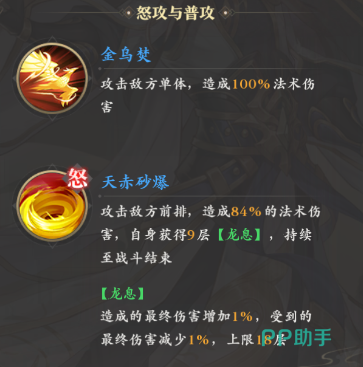 技能方面,武煌可以主动施放“金乌焚”和“天赤砂爆”,前者是较为平庸的100%单体法术伤害,后者则可以直接攻击敌人一整个前排,不过伤害的加成倍率只有84%,但在攻击完成后会获得9层龙息,每层都可以带来1%的增伤与免伤,并且最高可叠加至18层。