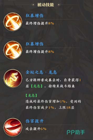 被动这块,他有着两个8%的增伤和三个提升攻击力的效果,此外,其专属的被动“金蛟之息·龙息”也十分有特色,可以令其在普攻暴击时也同样获得一层龙息。