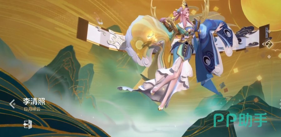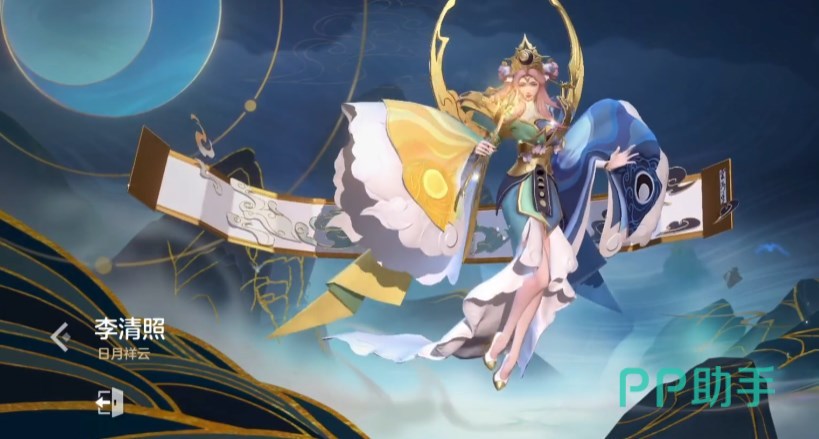 日月祥云,这款皮肤制作也非常精良,整个服装包含了光暗两种元素,一侧的服装是明艳的亮黄色与白色祥云,那一侧则是暗蓝色,正好对应日与月。背后的画轴中也是有白色与黑色两种颜色的祥云。动态展示中李清照拿着手中的拂尘,摆向一侧背后则出现对应白天与黑夜的景象,真的很用心了。