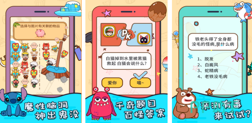 《烧脑瓶子》是大家都非常熟悉的脑筋急转弯游戏,创新整个题目,在这里会有超多的关卡等你完成。多种不同的热门主题,都可以在这里体验,让大家通过简单的休闲解谜来完成任务。非常精良的游戏画风,和朋友们一起在这里玩耍,脑洞大开。每一个关卡中都会有极其具有脑洞的游戏设定,无论是舞蹈,拼图还是消除方块,甚至还有染色等超多的游戏主题,大家都可以在这里获得极其欢乐的体验。如果不知道如何过关,也可以求助自己的朋友们,帮助你快速的答题,解锁更多丰富的关卡设定。