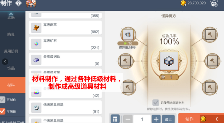 另外就是关于材料的制作和使用,游戏中不少高稀有度材料的掉落非常感人。导致有些时候玩家们很难进行这些材料的刷取,因此部分的高稀有材料玩家们可以通过制造系统将一些低稀有的材料制造合成获得。
