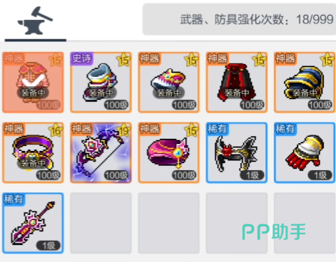 接下来是橙色神器装备,这类装备大部分都是中后期才可以获得,也是绝大部分玩家在中后期的主力装备,它们最多可以强化到100级。绿色的传说装备是需要制作才可以出来的,也是现版本很多平民玩家的毕业装备,最高200级。最后的红色装备是小康或者氪佬的毕业装,最高强化250级。