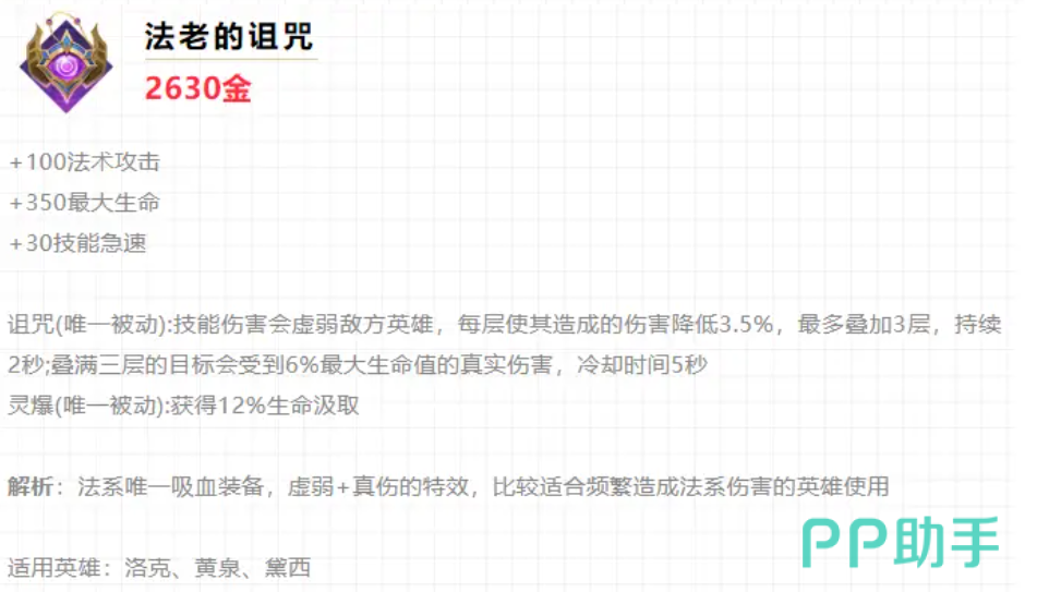 巫王法典:这件装备可以增加黄泉的法术攻击和最大生命值,提高她的输出和坦度。同时,这件装备还有一个被动效果,每次释放技能后,可以为黄泉增加一层护盾,抵消一定量的伤害。冰霜哀歌:这件装备可以增加黄泉的法术攻击和法术穿透,提高她对敌人的伤害。同时,这件装备还有一个被动效果,每次释放技能后,可以为黄泉附加一层冰霜效果,减少敌人的移速和攻速。