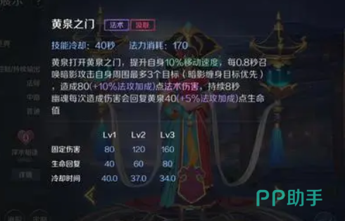 他的技能有以下几个特点:被动技能:能从附近参与的主攻及击杀中持续获得血量及法术加成,最多可以叠加20层。这让黄泉在后期拥有更高的法术强度和生命值,非常适合团战。一技能:对敌方造成4秒的持续伤害,并且如果目标在4秒内死亡,该效果会转移到最近的一个敌方英雄身上。这个技能可以让黄泉在团战中不断地传播伤害,打出惊人的输出。