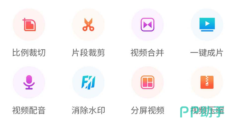 通过下图大家也能看到,其功能是非常的丰富且强大,像裁剪、合并以及配音等,这些大家都是能够见到的,还能一键为用户消除水印,针对动漫作品进行分割和压缩。