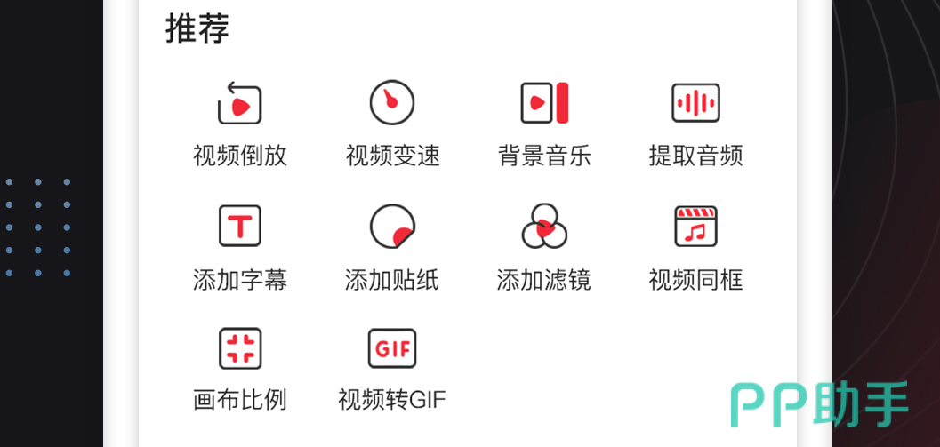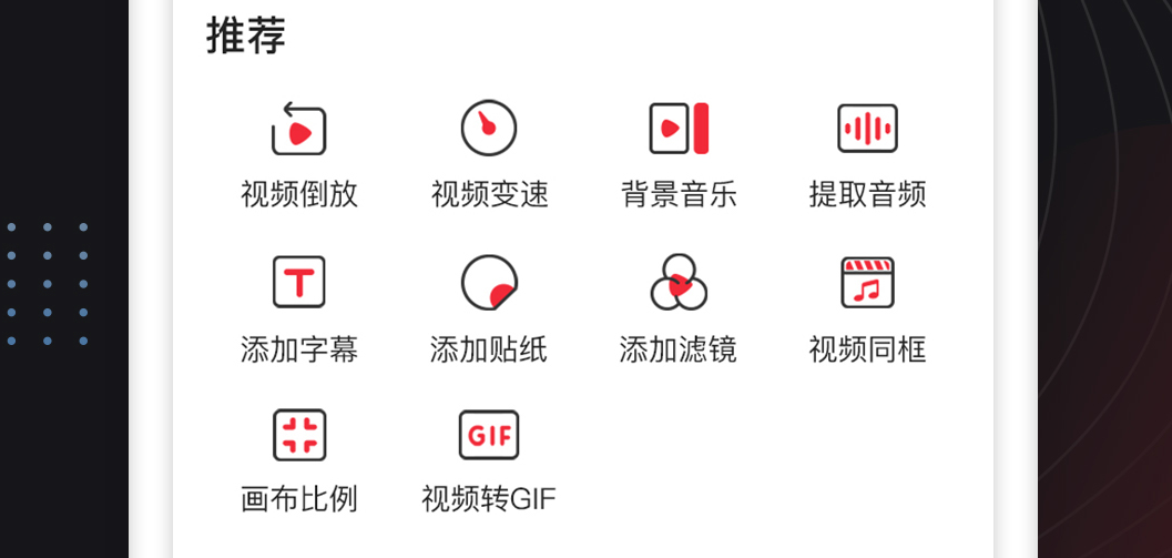 软件具备视频倒放功能,同时还能为自己的视频进行变速,拥有海量的背景音乐能够去进行提取,同时各类音频大家都是能够见到,还能为作品添加字幕和贴纸,各类滤镜也是能够去选择的。