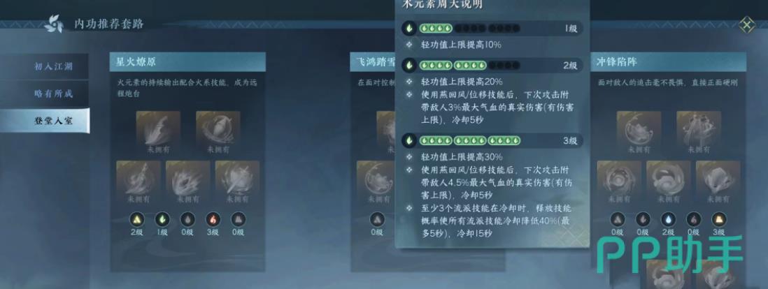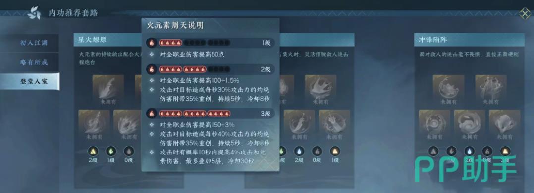 另一套同样是三金+三火,但是在更换了一些内功后,就把日月两仪以及荡剑扬波给换了下来,把先前组合中的灭阵和破釜给换了下来,如果想要保证输出的稳定性,可以把暗棘换成破釜,这样可以让这个职业的输出有一个很大的提高,可以说这是目前组合中输出最好的一套,更适合 PVE机制。