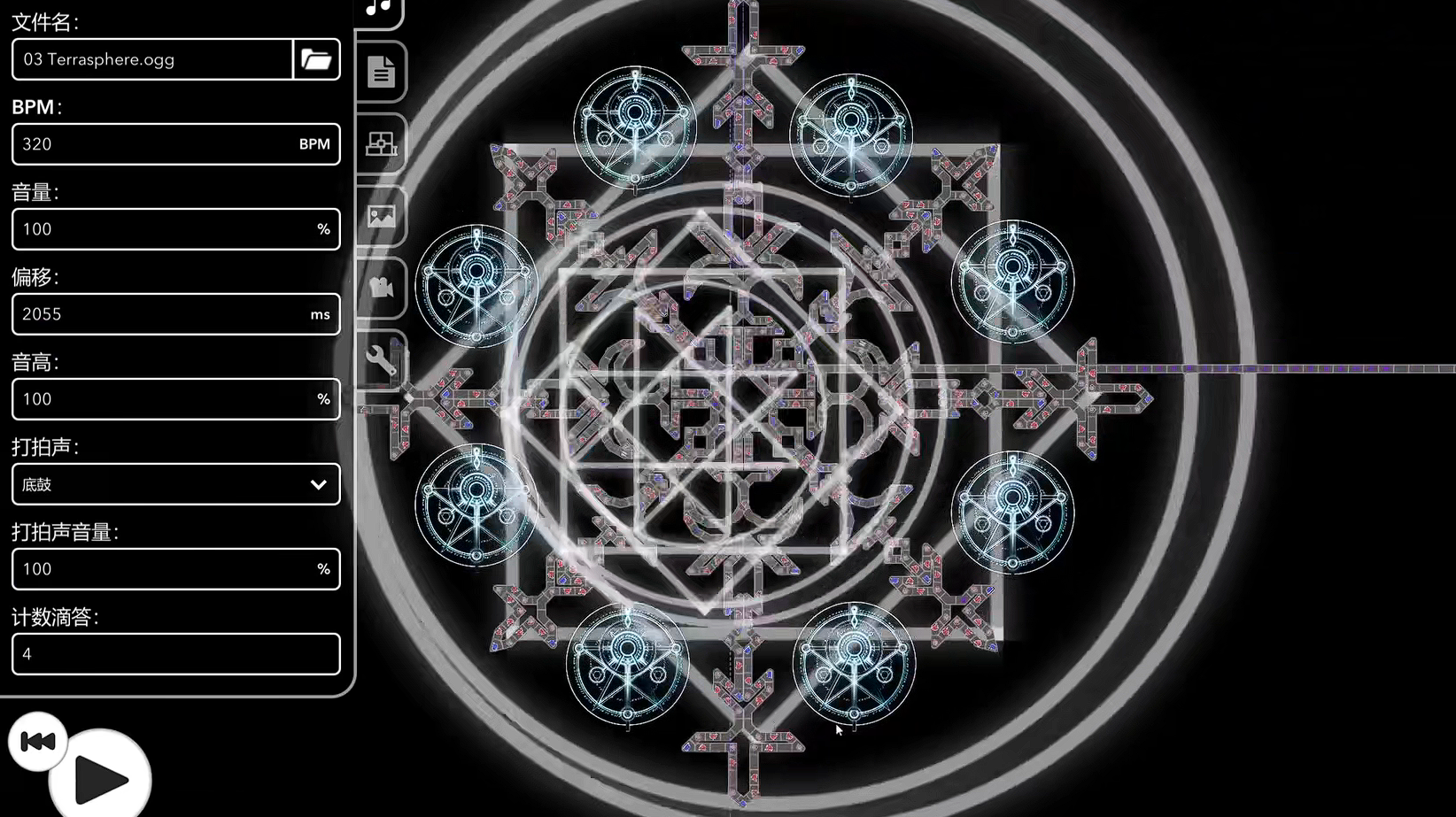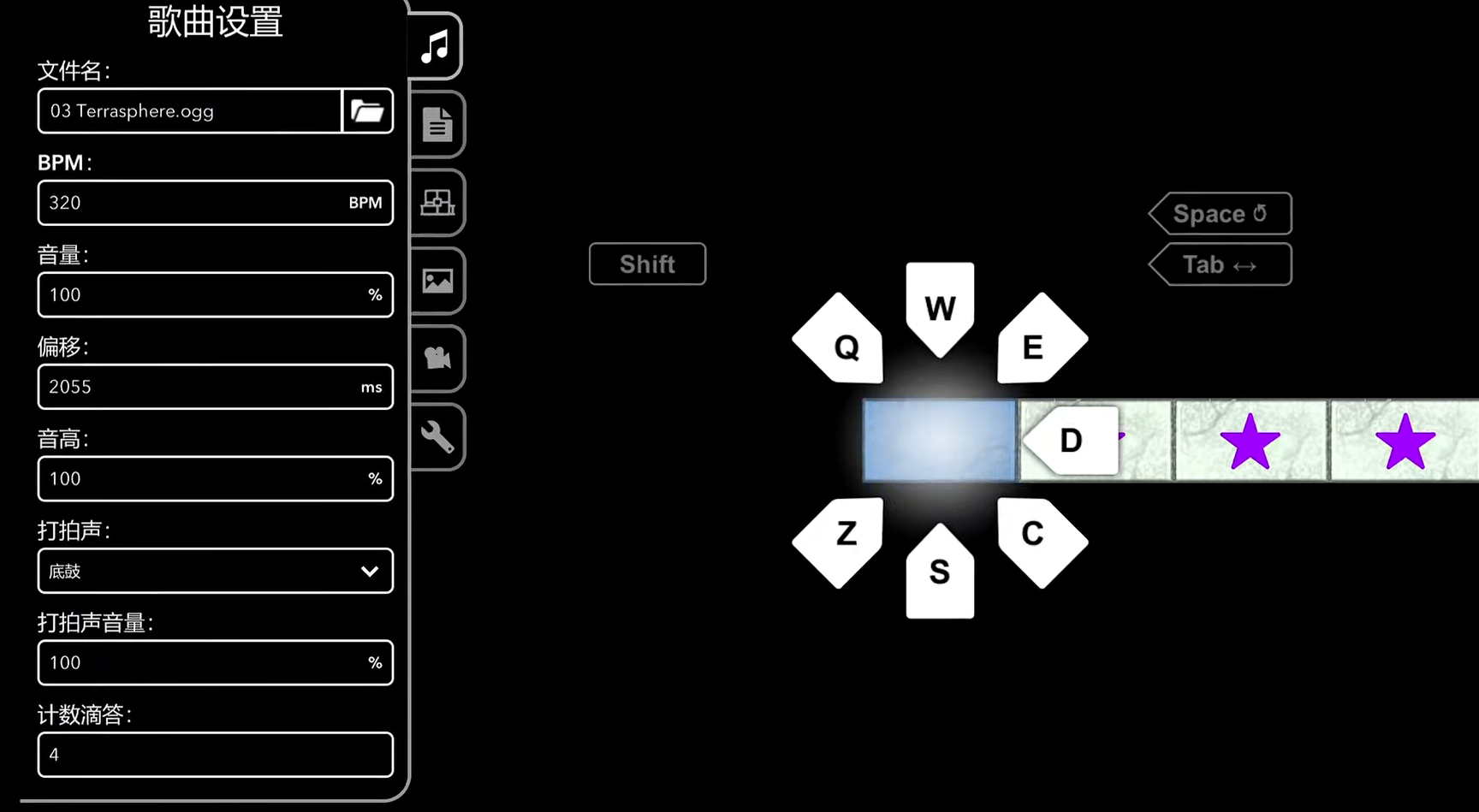 首先,作为一个关卡最重要的就是他的复活点,玩家们可以自行通过按键调整不同复活点的位置,选择要添加复活点的板块,点击玩法按钮的复活点一栏即可以进行设置。同时也可以在这里进行歌曲的设置,包括节拍声音偏移角度以及音量等等。