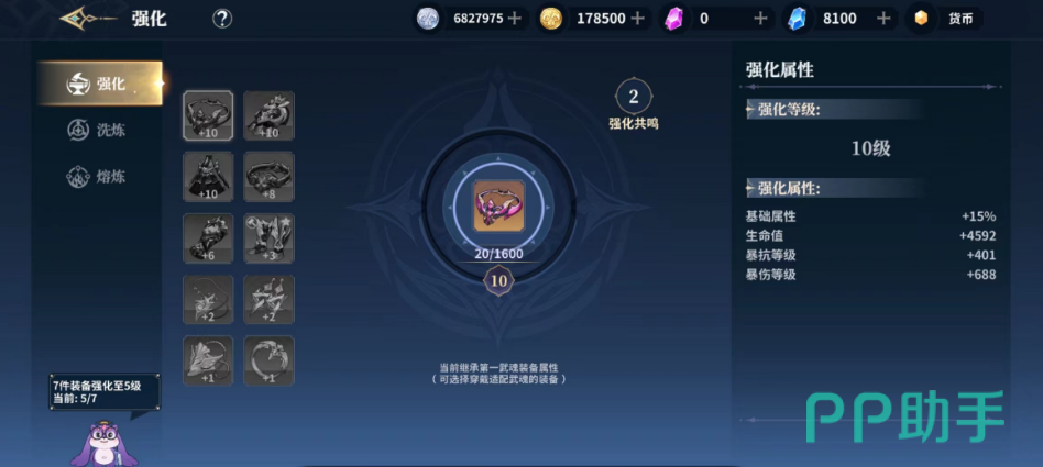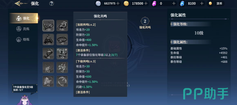 而且在上面大家强化之后的经验,在大家进行装备更换的时候是会百分百的继承到下一个装备上面的,所以大家不用担心自己升级了之后后续换装备该怎么做,在大家将所有的装备全部都强化到规定的等级之后大家就可以看到产生的共鸣效果。