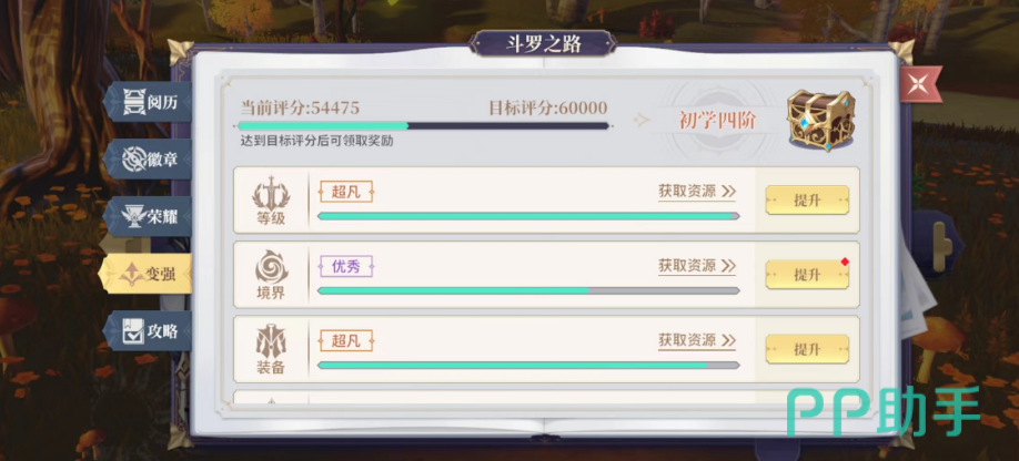 变强的页面大家就可以查看到所有可以让大家战力变强的玩法有什么,哪一个玩法现在可以刷新,上面就会出现红点,而大家可以去参与相应玩法获取评分,评分满足升阶之后右边的宝箱大家就可以领取奖励。最后一个可以选择的就是攻略,相当于是游戏中大家有什么不懂的都可以子这个页面查询,补给有道具讲解,就连伙伴以及装备什么都都有讲解攻略。