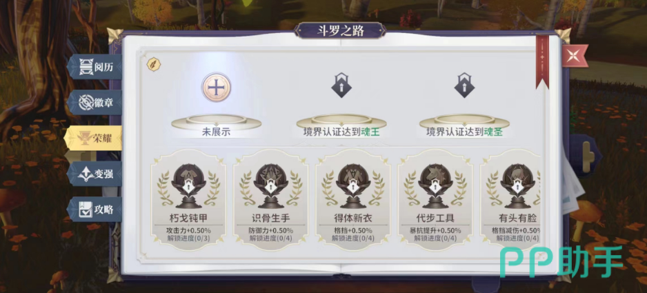 只要完成每一栏的相应成就就可以提升自己的徽章等级,每提升一个等级就可以在右边开宝箱拿到蓝晶奖励啦。第三个荣耀则是跟大家参与的境界玩法有关,魂师提升的境界越高的时候大家就可以在上面获取足够的攻击、防御加成效果。