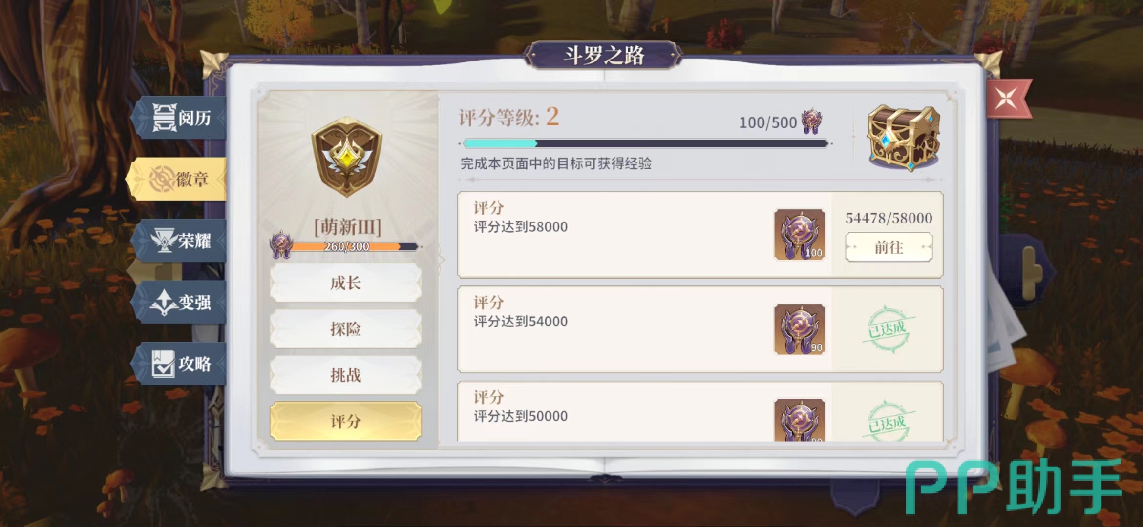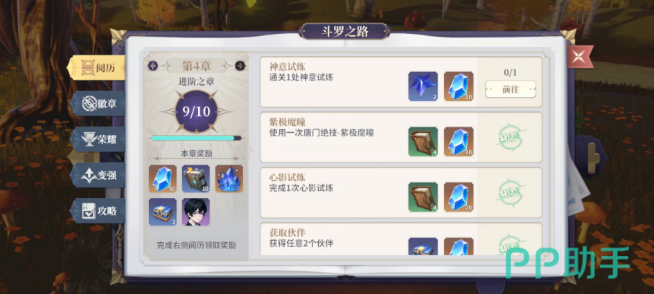 进入斗罗之路之后大家就可以看见五个类别可以选择,阅历里面是可以看到目前大家参与到第几个章节的剧情了,每次在主线中大家完成了一个章节之后就可以到阅历里面看看,右边的小任务要是都完成的话就可以拿到这个章节的奖励。第二个徽章系统则是更像一个成就系统,在上面大家可以看到成长栏、探险栏、挑战栏以及评分栏。
