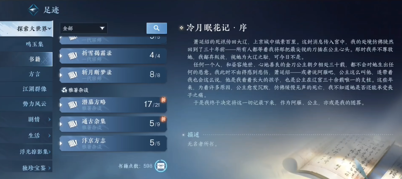 除了书籍类的收集要素,游戏中还有一些比较特殊的收集项目,比如学习各类方言,以及通过触发一些奇遇完成的江湖群像,这些都需要各位尽量收集完毕,此时角色的尘缘值可以达到60左右,这样就基本算是在这类收集要素中拿到了及格分;然后各位在剧情收集上凑够440,这一项总体来说还算是比较好完成,基本上跟着剧情做任务,就可以轻松达成。
