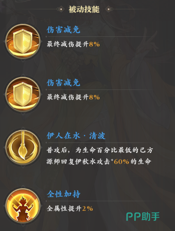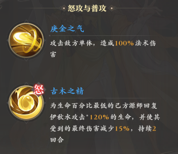 怒攻方面,伊秋水的“古木之精”可以对己方的残血队友回复120%共计的生命,同时还能为其附加两回合的15%减伤。然后再来看被动,它的被动提供了共计16%的伤害减免,同时特有的“伊人在水·清波”还让其普攻也具有了怒攻那样回复队友血量的能力。