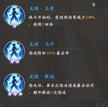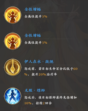 接着就是三个共计8%的全属性提升,然后另一个伊秋水特有的被动“伊人在水·潋滟”则可以进一步提升怒攻的治疗率,觉醒后还可以激活“无暇”系列的四个被动,第一个被动“无暇·缥缈”可以在怒攻后提升己方受治疗队友10%的免伤。